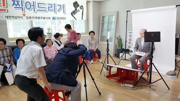 경기 안산시 대한적십자사 일동 어깨동무봉사회는 최근 지역내 4개 경로당 노인 100명을 대상으로 ‘건강 기원 장수사진 무료촬영’ 봉사활동을 펼쳤다. 사진은 노인들이 사진 촬영을 하는 모습.(사진제공=안산시청)