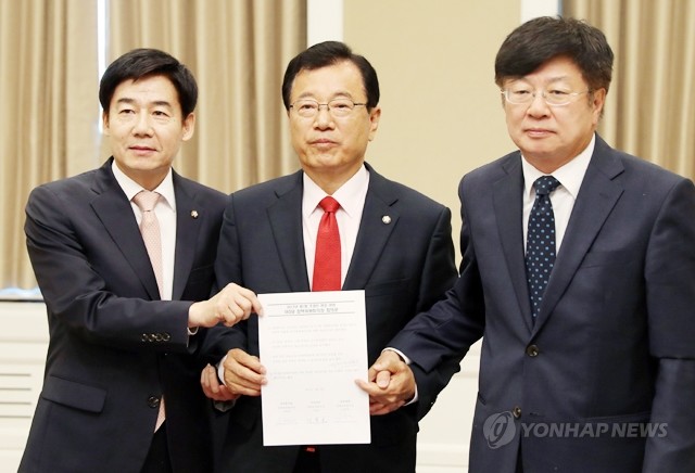 13일 오전 서울 여의도 국회에서 야3당 정책위의장들이 조찬회동을 마치고 합의문을 들어 보이고 있다. 왼쪽부터 국민의당 이용호·자유한국당 이현재·바른정당 이종구 정책위의장.