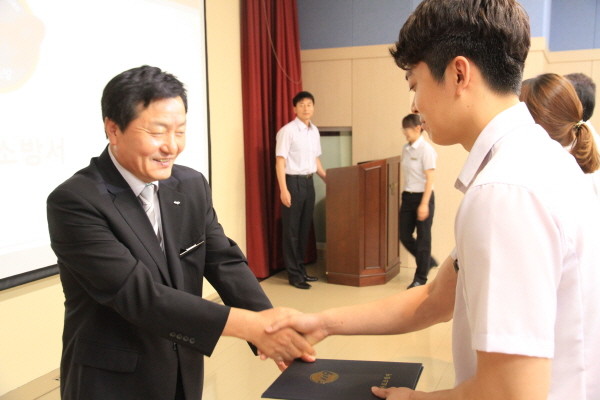 서울 마포소방서는 14일 4층 강당에서 심장이 정지된 환자의 심장을 다시 뛰게 한 구급대원 등 4명에게 하트세이버 인증서 및 배지를 수여했다. 사진은 이재옥 서장이 구급대원들과 악수하는 모습.(사진제공=마포소방서)