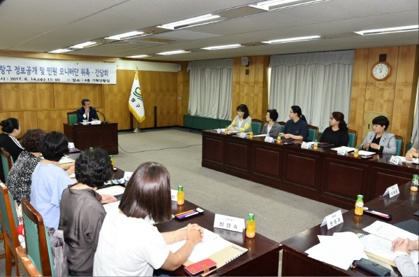 서울 중랑구는 지난 14일 오전 11시 구청 기획상황실에서 정보공개 및 민원모니터단에 대한 위촉장 수여와 간담회를 진행했다. 사진은 나진구 구청장과 민원모니터단 관계자들이 이야기를 나누는 모습.(사진제공=중랑구청)