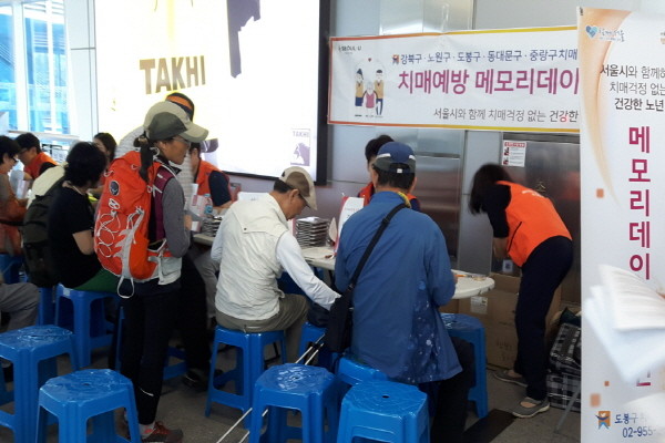 서울 도봉구는 지난 14일 강북·노원·동대문·중랑구 등 4개 자치구와 함께 도봉산역 일원에서 ‘치매도 예방과 치료·관리가 가능하다’는 주제로 ‘연합 메모리데이 캠페인’을 전개했다. 사진은 관계자들이 방문객을 대상으로 상담을 진행하는 모습.(사진제공=도봉구청)