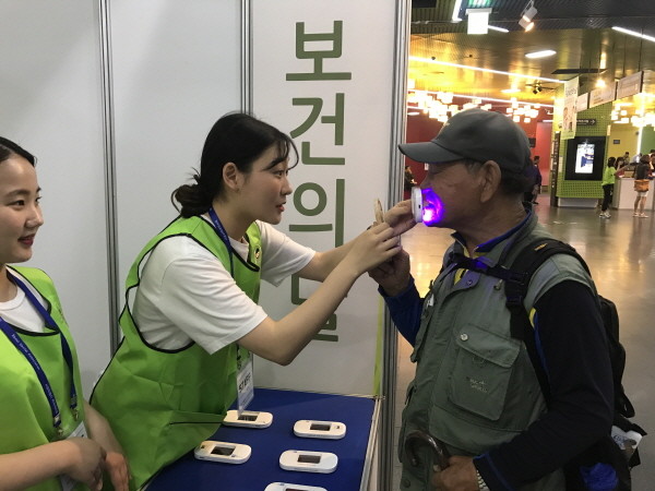 성동구보건소는 최근 ‘제72회 구강보건의 날’을 맞이해 서울시청 시민청에서 열린 ‘구강보건의 날 캠페인’에 참여했다. 사진은 캠페인에 참여한 구 보건소 관계자가 부스 방문객을 대상으로 구강검진을 진행하고 있는 모습.(사진제공=성동구청)