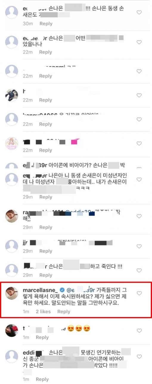 손나은은 과거 자신의 인스타그램 게시물 댓글을 통해 “가족들까지 그렇게 욕해서 이제 속 시원하세요? 제가 싫으면 제 욕만 하세요. 말도 안 되는 말들 그만하시고요”라고 전했다.