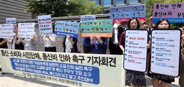 | ▲ 15일 오후 서울 종로구 통의동 국정기획위 앞에서 통신소비자 시민단체 회원들이 4G를 포함한 보편적 요금 인하를 촉구하고 있다.(사진제공=연합뉴스) | ||