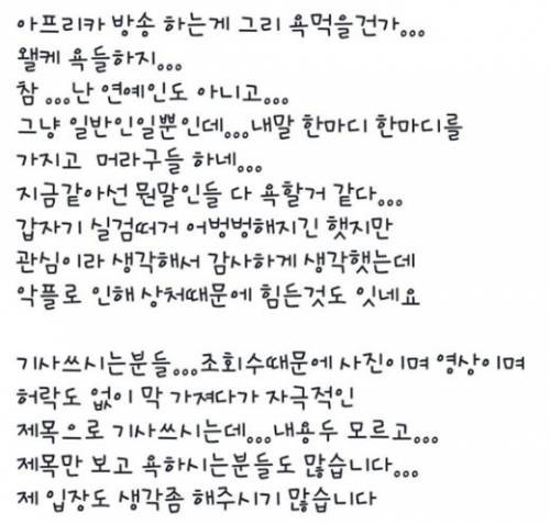 그는 “아프리카 방송 하는 게 그렇게 욕먹을 일인가 왜 이렇게 욕을 하지”라며 “난 연예인도 아니고 그냥 일반인일뿐인데 내 말 한마디 한마디를 가지고 뭐라고 한다”고 했다.
