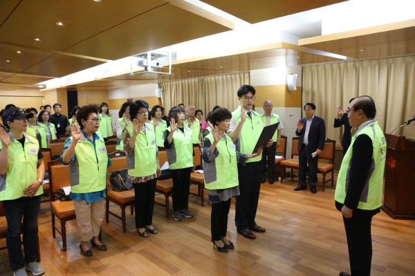 최근 서울 구로구청에서 복지 사각지대에 놓인 소외계층을 발굴해 민간자원을 연계하고 지원하는 구로구사회복지협의회 ‘좋은이웃들’ 봉사단 발대식이 개최됐다. 사진은 ‘좋은이웃들’ 봉사단 대표가 선서를 하고있는 모습.(사진제공=구로구청)