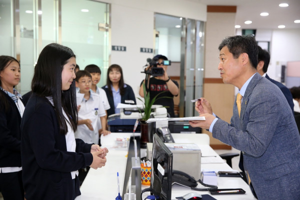 서울 성북구가 지난 15일부터 전동 주민센터에서 ‘아동·청소년 동행(同幸)카드’ 발급을 시작했다. 사진은 일일 주민센터 ‘아동·청소년 동행카드’ 발급 업무를 맡은 김영배 구청장이 1호 정예인 학생에게 카드를 건네며 이야기를 나누는 모습.(사진제공=성북구청)