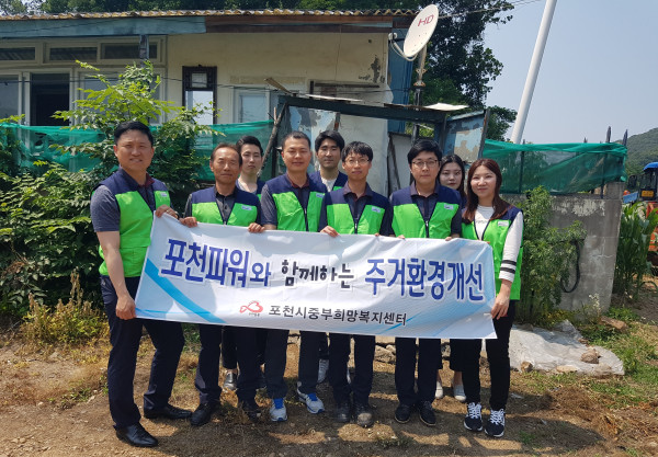 최근 경기 포천시 중부희망복지센터는 포천파워 직원 10명과 함께 창수면 지역의 홀몸노인가구를 방문해 청소 지원을 실시하고, 후원 물품을 전달했다. 사진은 봉사활동 종료 후 포천화력 및 센터 관계자들이 기념촬영을 하는 모습.(사진제공=포천시청)