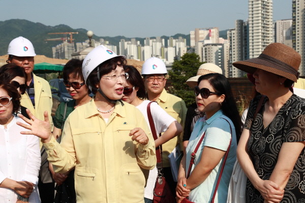 지난 15일 박춘희 서울 송파구청장이 위례서로 대체 임시도로 개설 공사현장 및 위례 자전거도로 특화지구 조성사업 계획구간 등을 방문, 위례동 일대 교통 개선 현장 점검을 실시했다. 사진은 현장에서 개선 방안에 대한 주민들의 질문을 받고 있는 박 구청장(오른쪽 세 번째)의 모습.(사진제공=송파구청)