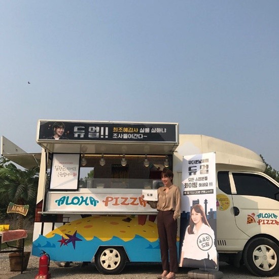 김정은은 최근 자신의 개인 SNS에 '듀얼'을 응원하는 피자차 앞에서 찍은 사진을 게재했다.