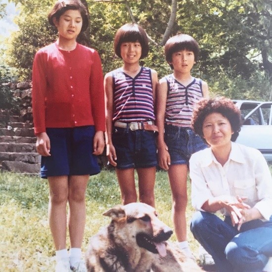 해당 사진에는 여성 한 명과 그의 자녀로 보이는 아이들 셋, 강아지 한 마리가 담겨있다.
