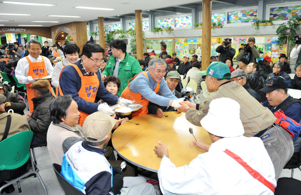| ▲ 다일공동체와 함께 하는 ‘밥퍼 배식봉사활동’에 참여한 문재인 대통령과 유덕열 구청장의 모습.(사진제공=동대문구청) | ||