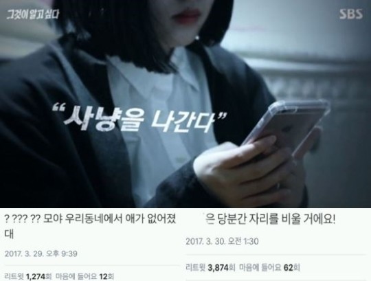 방송에 따르면 김양과 박양은 캐릭터를 통해 역할극을 하는 ‘캐릭터 커뮤니티’에서 만났고, 트위터로 소통했다. 실제 범행을 저지른 직후 두 사람은 메신저로 “잡아 왔다. 상황이 좋았어” “살아있어, 여자애야” 등의 대화를 나누기도 했다.