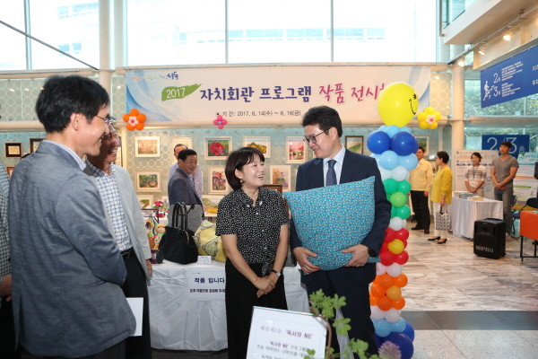 서울 성동구는 지난 14~16일 구청 1층 비전갤러리에서 열린 ‘2017 자치회관 프로그램 작품 전시회’를 성황리에 마무리했다. 사진은 정원오 구청장(오른쪽)이 작품전시회를 찾아 전시된 작품들을 둘러보며 관계자들과 이야기를 하는 모습.(사진제공=성동구청)