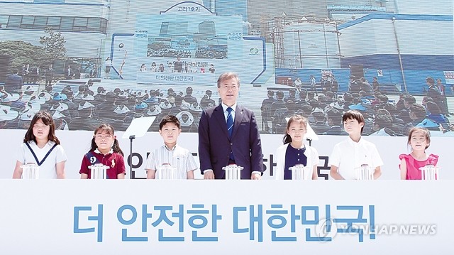 문재인 대통령이 19일 오전 부산 기장군 장안읍 해안에 있는 고리원전 고리1호기 영구정지 선포식에서 어린이들과 함께 영구정지 터치버튼을 누르며 세레머니를 하고 있다.