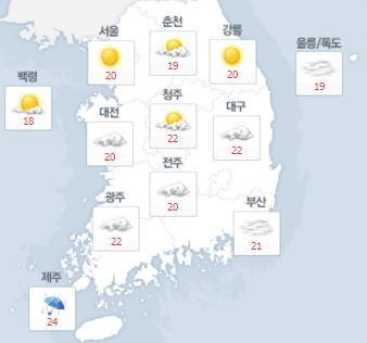 20일 오전 서울은 20도, 춘천 18도, 청주 20도, 대전 19도, 대구 21도, 부산 19도, 광주 20도, 제주도는 22도를 기록 중이다.