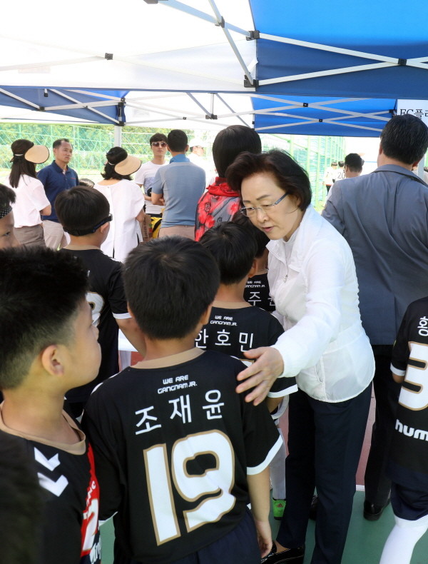 최근 강남구 마루공원에서 풋살 꿈나무의 조기 발굴 및 협동정신 함양, 구민의 체력증진을 위해 열린 ‘제3회 구청장배 풋살대회’에 참석한 신연희 구청장이 경기에 나서는 어린이 선수단을 격려하고 있다.(사진제공=강남구청)