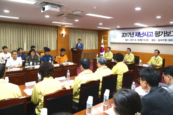 서울 강서구는 지난 19일 오전 10시30분 구청 대회의실에서 안전관리 매뉴얼 일제정비와 유관기관 간 유기적 협력체계를 점검하기 위한 ‘2017 재난사고 평가보고회’를 개최했다. 사진은 노현송 구청장이 발언을 하고 있는 모습.(사진제공=강서구청)