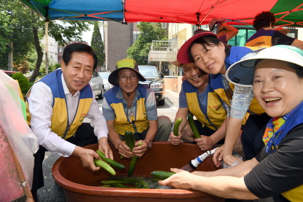 이용주 서울 영등포구의장은 지난 16일 오전 8시 당산1동 주민센터 앞에서 당산1동 자원봉사연합회 주관으로 열린 ‘김치 나눔 봉사활동’에 참여했다. 사진은 이 의장(왼쪽)과 연합회 회원 등 봉사자들이 오이를 세척하고 있는 모습.(사진제공=영등포구의회)