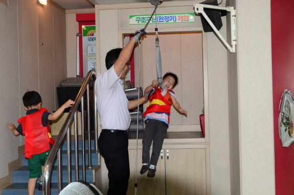 서울 영등포소방서는 최근 양산로에 위치한 영은어린이집 원아를 대상으로 '안전체험관'을 운영했다. 사진은 어린이들이 화재발생시 완강기를 이용해 탈출하는 체험을 하는 모습.(사진제공=영등포소방서)