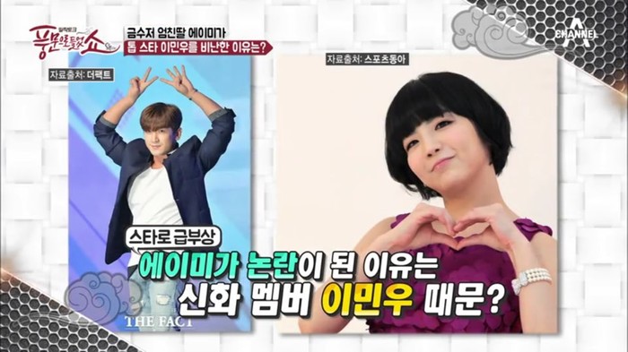 '스포츠조선'은 관계자의 말을 빌려 에이미가 19일 한국의 한 종합편성채널의 연예 프로그램을 접한 뒤 충격과 억울함에 잘못된 선택을 했다고 보도했다. 한 패널은 "에이미가 리얼리티 프로그램을 통해 유명해지면서 함께 출연했던 신화의 이민우와 실제로 연인이 된 사례가 있었다. 결별 후 에이미는 이민우씨가 사실 이야기를 하고 변명들을 늘어놔서 이별을 결심했다"고 전했다.