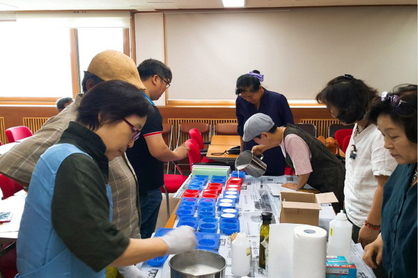 경기 여주시농업기술센터에서 육성하는 여주시 귀농귀촌연구회는 지난 20일 농업기술센터 세미나실에서 과제교육을 실시했다. 사진은 참여자들이 '귀농귀촌 체험 프로그램'에 적용할 수 있는 비누공예 만들기 체험을 하는 모습.(사진제공=여주시청)