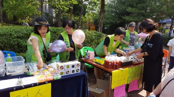 최근 양천구자원봉사센터소속인 신정7동 자원봉사캠프와 송아리가족봉사단의 공동주최로 세양청마루아파트 앞 쌈지공원에서 신정7동 마실나눔장터가 열렸다. 사진은 참여자들이 물건을 판매하는 모습.(사진제공=양천구자원봉사센터)