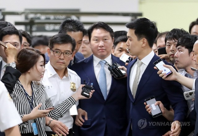 SK그룹 최태원 회장이 박근혜 전 대통령과의 단독 면담과 K스포츠재단에 대한 추가 지원 협의 과정 등을 증언하기 위해 박 전 대통령 재판이 열리는 22일 오전 서울 서초구 서울중앙지법에 증인으로 출석하고 있다.