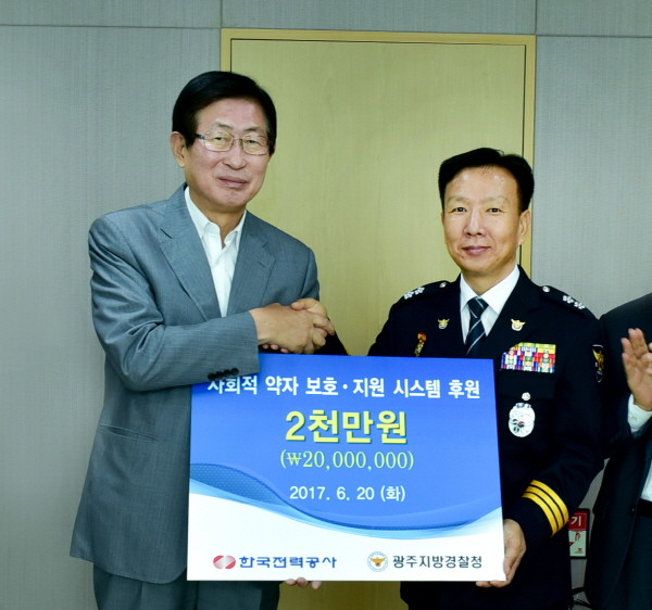 | ▲ (왼쪽부터) 조환익 한전 사장, 이기창 광주지방경찰청장이 기념촬영을 하고 있다. | ||