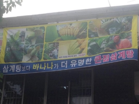 공개된 사진에는 바나나 나무의 주인이 직접 내건 현수막이 담겼다. 건물을 뒤덮을 정도로 커다란 현수막에는 ‘삼계탕보다 바나나가 더 유명한 큰집삼계탕’이라고 적혔다.