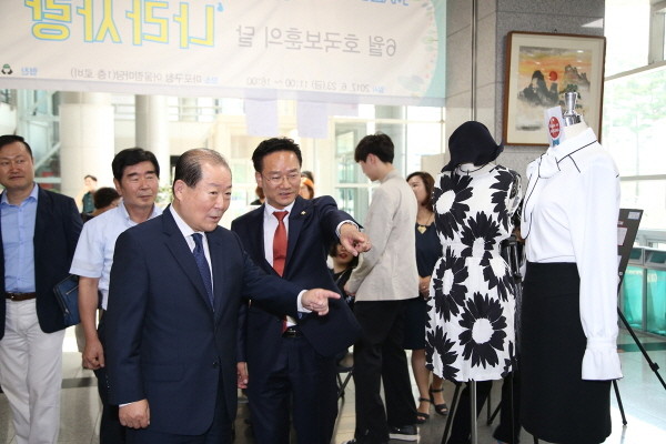 지난 23일 오전 박홍섭 마포구청장(맨앞)이 6월 '호국의 달'을 맞아 마포구청 1층 어울림마당에서 개최된 '나라사랑 공익바자회'에 참석해 마포구의회 허정행 의원(오른쪽)과 이야기를 나누고 있다.(사진제공=마포구청)