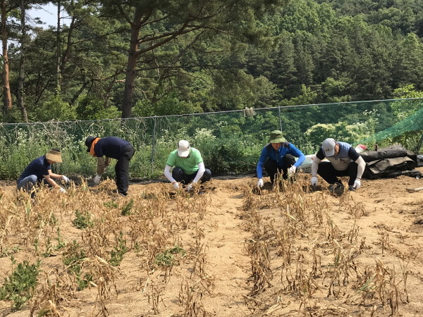 충남 아산시 자치행정과는 최근 자매결연 마을인 송악면 거산1리를 찾아 농촌일손돕기 봉사활동을 펼쳤다. 사진은 참여자들이 일손이 부족한 농가에서 마늘수확 작업을 진행 중인 모습.(사진제공=아산시청)