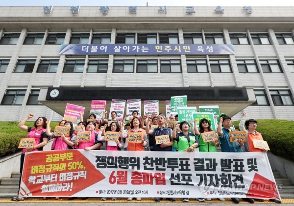 앞서 전국학교비정규직연대회의는 지난 5월22일부터 지난 20일까지 진행한 ‘쟁의행위 찬반투표’에서 참여자의 89.1%인 4만1156명이 쟁의에 찬성하고 지역별로 29일과 30일 파업에 들어간다고 밝혔다.
