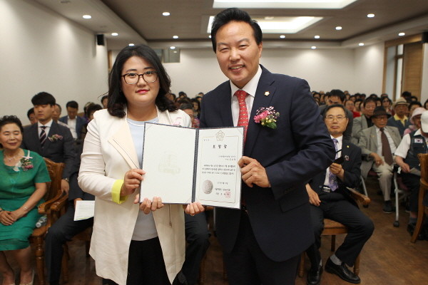 | ▲ 대국민 화합통일 강동구 전진대회에 참석한 조동탁 의장(오른쪽)이 표창창을 수여하고 수여자와 함께 기념촬영을 하고있다.(사진제공=강동구의회) | ||