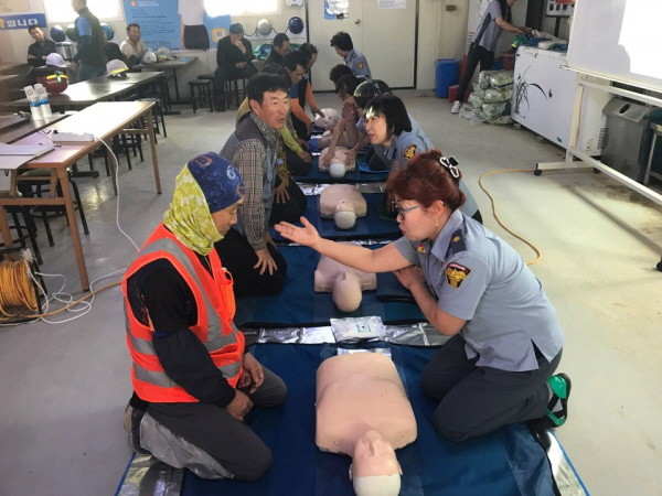 경기 안성소방서는 지난 27일 공도읍에 위치한 서해그랑블아파트 건설현장을 방문해 건설현장 근로자 200여명을 대상으로 ‘찾아가는 심폐소생술 교육’을 실시했다. 사진은 소방서 관계자에게 건설현장 근로자들이 심폐소생술 교육을 받는 모습.(사진제공=안성소방서)