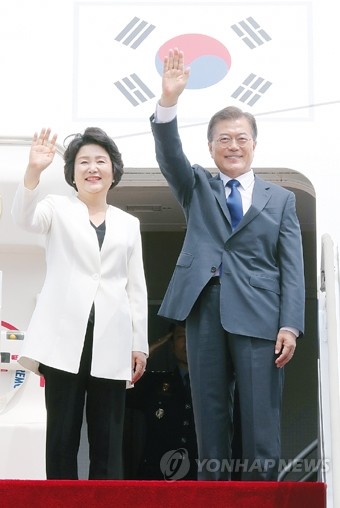 문재인 대통령과 부인 김정숙 여사가 28일 오후 서울공항에서 미국으로 출발하기에 앞서 손을 들어 인사하고 있다.