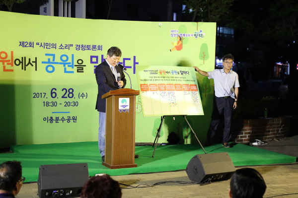 경기 평택시는 지난 28일 이충분수공원에서 공재광 시장과 지역주민 등이 참석한 가운데 지역의 공원·녹지·체육시설 등 시민의 여가생활욕구를 충족할 수 있는 해결방안을 모색하기 위한 '평택시 제2회 시민의 소리 경청토론회'를 개최했다.(사진제공=평택시청)