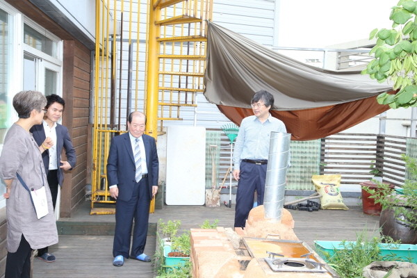 지난 27일 오전 박홍섭 마포구청장(가운데)이 지역내 위치해 있는 성미산학교에 방문해 박복선 성미산학교장(맨 오른쪽)을 비롯한 관계자들과 함께 학교 곳곳을 둘러보고 있다.(사진제공=마포구청)