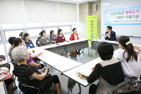 강동구가 지난 28일 오후 암사동에 위치한 구립 암사도서관 3층 문화교실에서 안심귀가 스카우트 대원 등 관계자 25명이 참석한 가운데 ‘제148차 찾아가는 구청장실’을 열었다. 사진은 이해식 구청장과 참여자들이 이야기를 나누는 모습.(사진제공=강동구청)