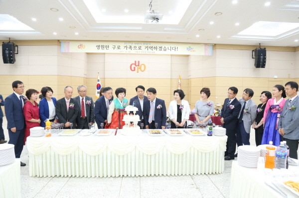 지난 28일 서울 구로구청 강당에서 퇴직자와 그 가족, 동료 직원 등이 참여한 ‘2017년 상반기 퇴임식’이 개최됐다. 사진은 이성 구청장(왼쪽 일곱 번째)이 참여자들과 함께 케이크의 촛불을 끄고 있는 모습.(사진제공=구로구청)
