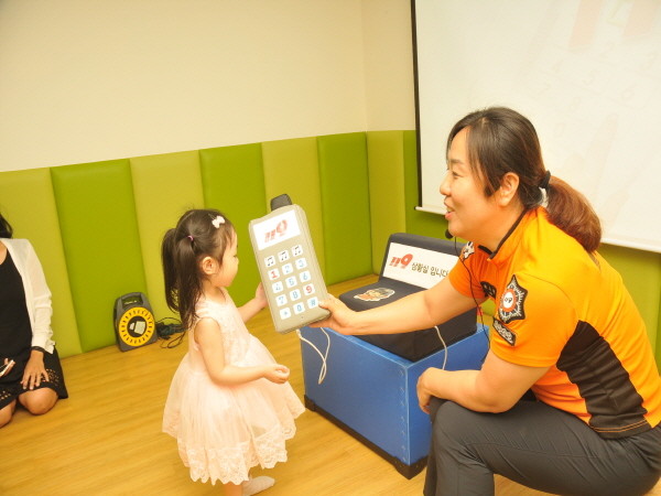 서울 서초소방서는 지는 28일 오전 예아어린이집 원생 및 지도교사를 대상으로 '소방안전 교육'을 실시했다. 사진은 어린이가 소방관에게 화재 발생시 119 신고요령에 대해 배우고 있는 모습.(사진제공=서초소방서)