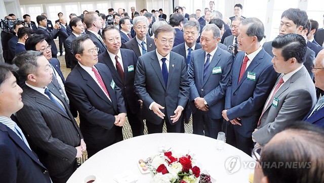 문재인 대통령이 28일 오후(현지시각) 미국 워싱턴 헤이 아담스 호텔에서 열린 우리 참여 경제인과의 차담회에서 허창수 GS회장(오른쪽에서 세 번째) 등 경제인들과 얘기를 나누고 있다.