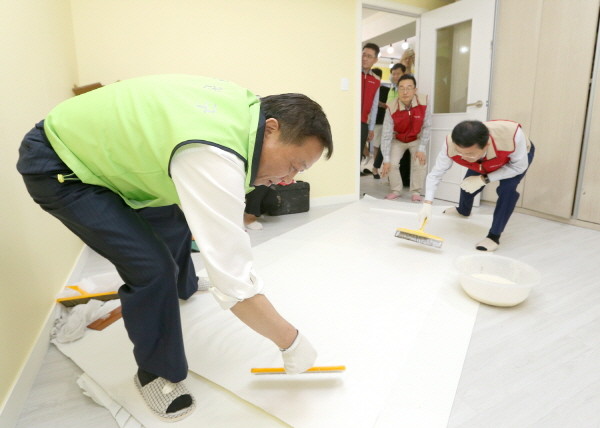 서울 금천구는 지난 29일 하늘 지역아동센터에서 롯데건설 임직원 40명이 참여해 환경개선 봉사활동을 진행했다. 사진은 차성수 구청장(왼쪽)과 하석주 롯데건설 대표이사가 도배를 하는 모습.(사진제공=금천구청)