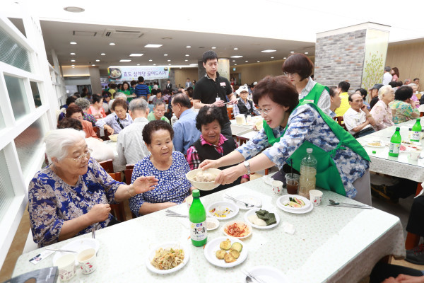 박춘희 서울 송파구청장은 지난 30일 구청 지하식당에서 무더운 여름을 잘 보낼 수 있도록 지역내 홀몸노인을 대상으로 삼계탕과 떡, 과일 등을 대접하는 ‘효도 삼계탕 끓여드리기’ 행사를 진행했다. 사진은 박 구청장이 노인들에게 배식봉사를 하고 있는 모습.(사진제공=송파구청)