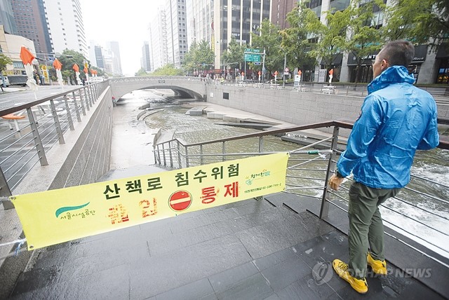장맛비에 불어난 물로 3일 오전 서울 중구 청계천 진입로가 통제되고 있다.