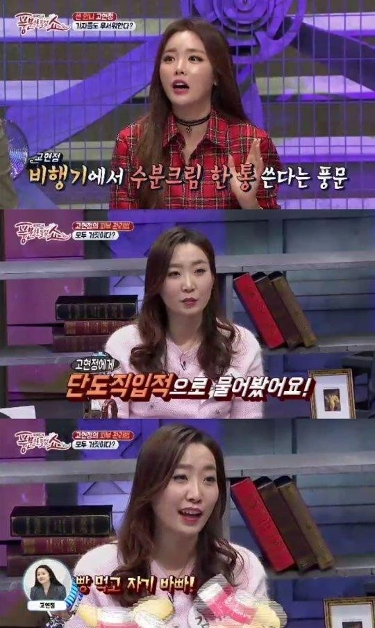 이날 MC 홍진영은 “고현정이 비행기를 타면 수분크림 한 통을 바른다는 소문을 듣고 직접 사서 써봤다. 사람마다 다르더라”고 말해 웃음을 자아냈다.