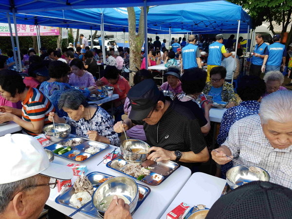 경기 수원시 권선구는 4일 세류2동 버드내경로당 앞 공원에서 올해 상반기 마지막 ‘참! 맛있는 행복밥차’를 운영했다. 사진은 노인들이 맛있게 삼계탕을 먹는 모습.(사진제공=권선구청)