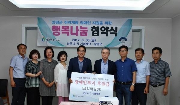 경기 양평군은 지난 6월30일 김선교 군수(왼쪽에서 다섯번째)와 이춘성 남궁 앤 강 기념재단 대표이사 등이 참여한 가운데 재단으로부터 지역내 취약계층 장애인을 위한 서비스를 제공받는다는 내용의 ‘행복나눔 협약’을 체결했다.(사진제공=양평군청)
