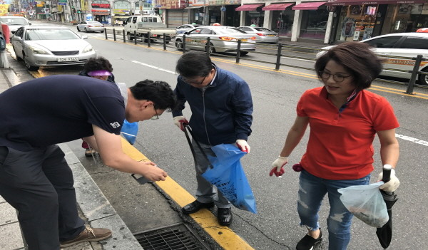 경기 이천시지속가능발전협의회는 지난 3일 시민단체와 함께하는 이천종합터미널 주변 아침 대청소를 실시했다. 사진은 조병돈 이천시장(가운데) 및 협의회 관계자들이 쓰레기를 수거하는 모습.(사진제공=이천시청)