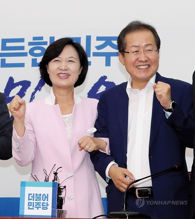 더불어민주당 추미애 대표가 4일 오후 국회 대표실을 방문한 자유한국당 홍준표 새 대표와 대화 도중 “우리가 서로 협치를 국민 앞에 약속한다는 의미에서 팔짱 한번 끼실까요?”라며 팔짱을 낀 뒤 함께 파이팅하고 있다.